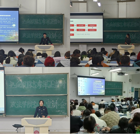 为切实开展2024年征兵宣传工作,帮助学生充分了解和掌握应征入伍相关政策,11月6日、13日晚上,政法学院在高新校区思贤楼119教室举办2024年大学生征兵宣讲会,学院2022级、2023级学生参加了活动。