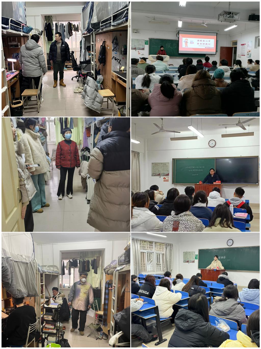 深入一线,关怀学生。2月26日,学院党政领导深入课堂,详细了解新学期课堂教学秩序、教师授课状态、学生学习情况。2月28日,学院党委副书记赵阿妮带领全体辅导员走访学生公寓。走访中,大家与同学们亲切交谈,仔细询问同学们的假期生活,勉励同学们坚持学勤行思、尚真务实的学风,努力学习、全面发展;教育引导学生做好宿舍安全检查,严禁将电动车电瓶带入宿舍充电,严禁使用大功率及违禁电器,不私拉乱接电线,确保宿舍安全。