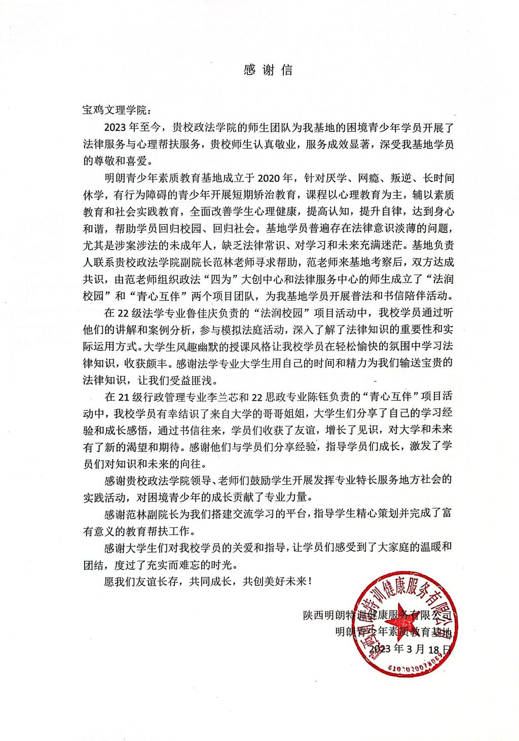 近日,政法学院收到来自陕西明朗特训健康服务有限公司、明朗青少年素质教育基地的感谢信,信中对学院领导以及“四为”大创中心和法律服务中心师生表达了诚挚的谢意。