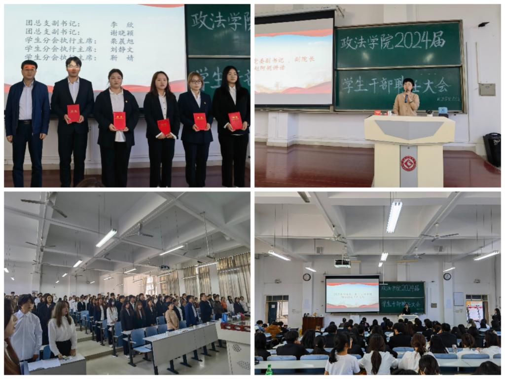 为进一步加强学生干部队伍建设,充分发挥学生干部在学院管理工作中的作用,10月15日中午,政法学院在高新校区思贤楼119教室举行2024届学生干部聘任大会。学院党委书记白志勇,党委副书记、副院长赵阿妮,学生辅导员及学院全体学生干部参加会议。
