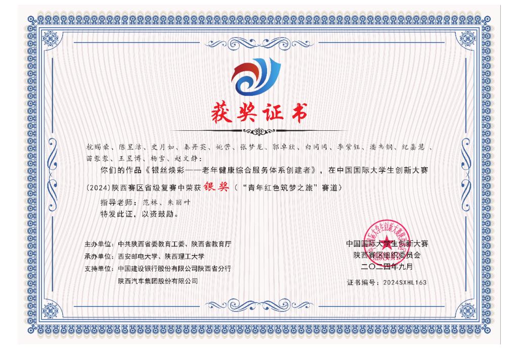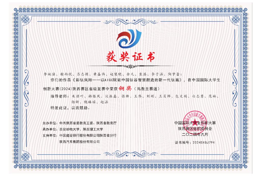 近日,中国国际大学生创新大赛(2024)陕西赛区省级复赛获奖名单揭晓。政法学院师生团队在本次大赛中表现出色,2022级行政管理2班杭赐豪负责的项目《银丝焕彩——老年健康综合服务体系创建者》(“青年红色筑梦之旅”赛道)(指导教师:范林、朱丽叶)获省级银奖、2022级行政管理2班李姚佳负责的项目《彩钛凤翔——以AIGC赋能中国钛谷智慧靓造的新一代钛画》(高教主赛道)(指导教师:朱丽叶、刘刚、白志勇、范林等)获省级铜奖。