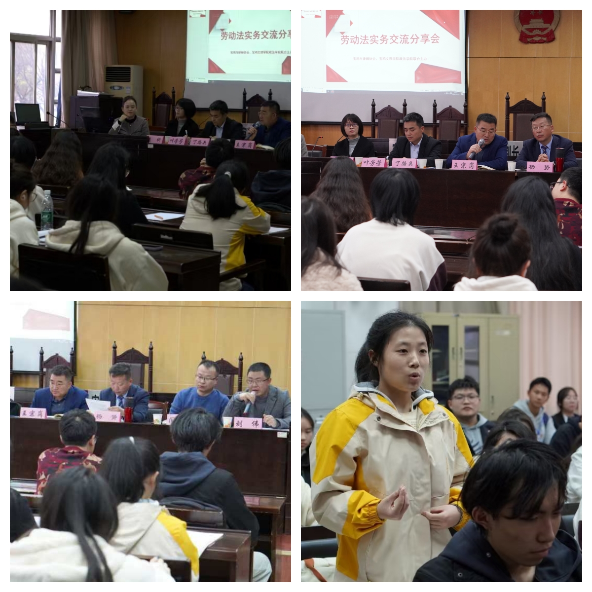 随后,刘伟、丁路兵、闫海兵、王宗岗四位律师结合相关案例,就劳动合同、工伤等劳动法律法规在实务中的运用和师生进行了分享交流,学生针对各位律师分享的鲜活案例和劳动法律法规积极提问,活动现场气氛活跃。最后,杨赟对活动作了总结发言。