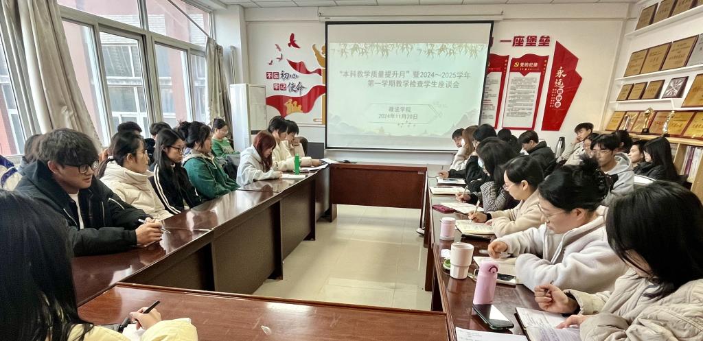 为加强教师与学生之间的交流,深入了解学生在本科学习过程中的各种问题,促进教育教学水平和人才培养质量不断提升,11月20日下午,政法学院在思贤楼320会议室召开了“本科教学质量提升月”暨2024-2025学年第一学期教学检查学生座谈会。座谈会由政法学院副院长范林主持,各系系主任、教学秘书、各班学生代表参加会议。