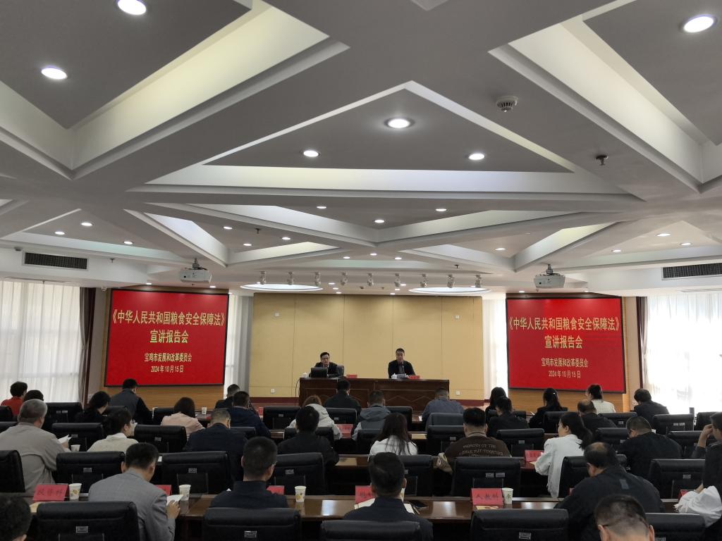 为宣传和贯彻落实《中华人民共和国粮食安全保障法》,应宝鸡市发展和改革委员会邀请,政法学院段振东老师于10月15日为全市发改(粮食)系统作专题报告。宝鸡市发改委党组成员、副主任李英虎主持报告会并讲话。全市各县(区)发改局分管领导、业务股长,委机关各科室、委属单位负责人和市耕地保护和粮食安全领导小组成员单位业务科长参加报告会。