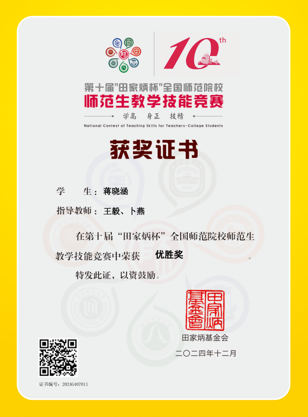 近日,第十届“田家炳杯”全国师范院校师范生教学技能竞赛结果揭晓,政法学院思想政治教育专业2023级1班学生蒋晓涵获得优胜奖,指导教师为王毅、卜燕。