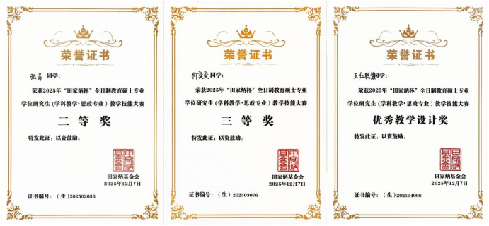 近日,2025年“田家炳杯”全日制教育硕士专业学位研究生学科教学(思政)专业教学技能大赛全国决赛在江西师范大学圆满落幕。我校太阳成tyc7111cc集团2024级学科教学(思政)专业研究生张青、仵奕奕、王仁聪慧分别荣获二等奖、三等奖和优秀教学设计奖。
