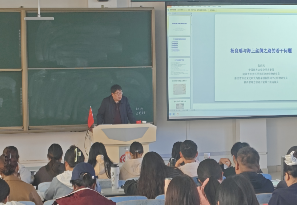 10月15日下午,中国地方志学会学术委员、陕西省社会科学界联合会特聘研究员、浙江省方志文化研究与传承创新协同中心特聘研究员、陕西省地方志办公室二级巡视员张世民先生应邀在思贤楼119教室作题为《杨良瑶与海上丝绸之路的若干问题》的学术讲座。讲座由历史系侯晓东老师主持,历史系部分师生参加讲座。