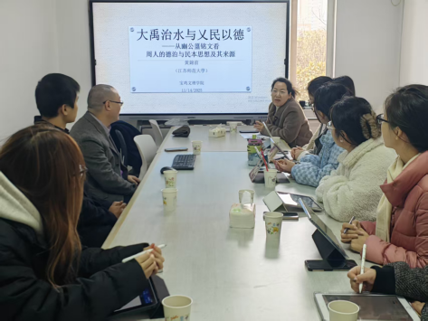 11月14日下午,江苏师范大学特聘教授黄锦前先生应邀在思贤楼213会议室作题为《大禹治水与乂民以德》主题讲座,副院长崔丽萍教授主持会议,张传海博士和哲学系部分研究生参加了讲座。