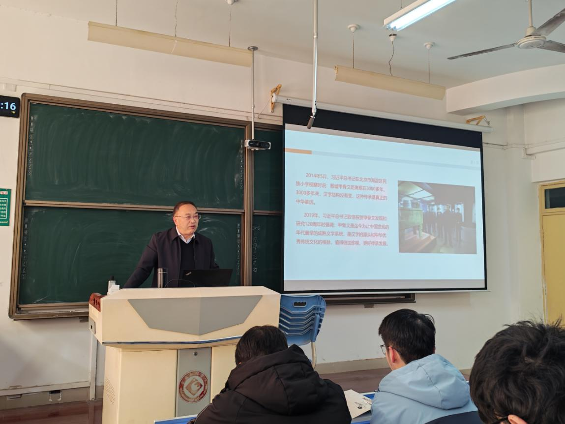 11月28日上午,在立心楼526多媒体教室,河南省甲骨文研究院二级教授郭旭东应邀为我院师生做了题为《中华基因——甲骨文的价值与研究现状》的学术报告。报告会由我院副院长崔丽萍主持。历史学专业部分教师与2023级全体学生参加了报告会。