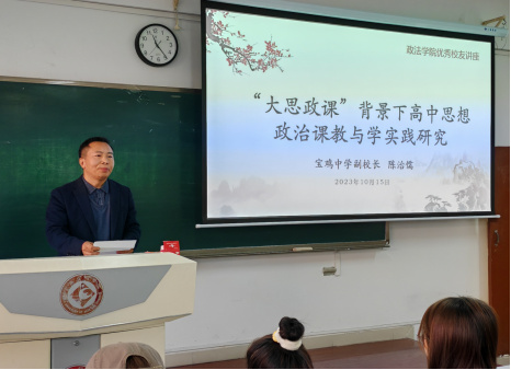 10月15日上午,我院2000级优秀校友、宝鸡中学副校长陈治儒受邀在思贤楼125教室作了题为“‘大思政课’背景下高中思想政治课教与学实践研究”的学术讲座。讲座由政法学院党委书记白志勇主持,2023级研究生以及2023级思想政治教育专业本科生参加了讲座。